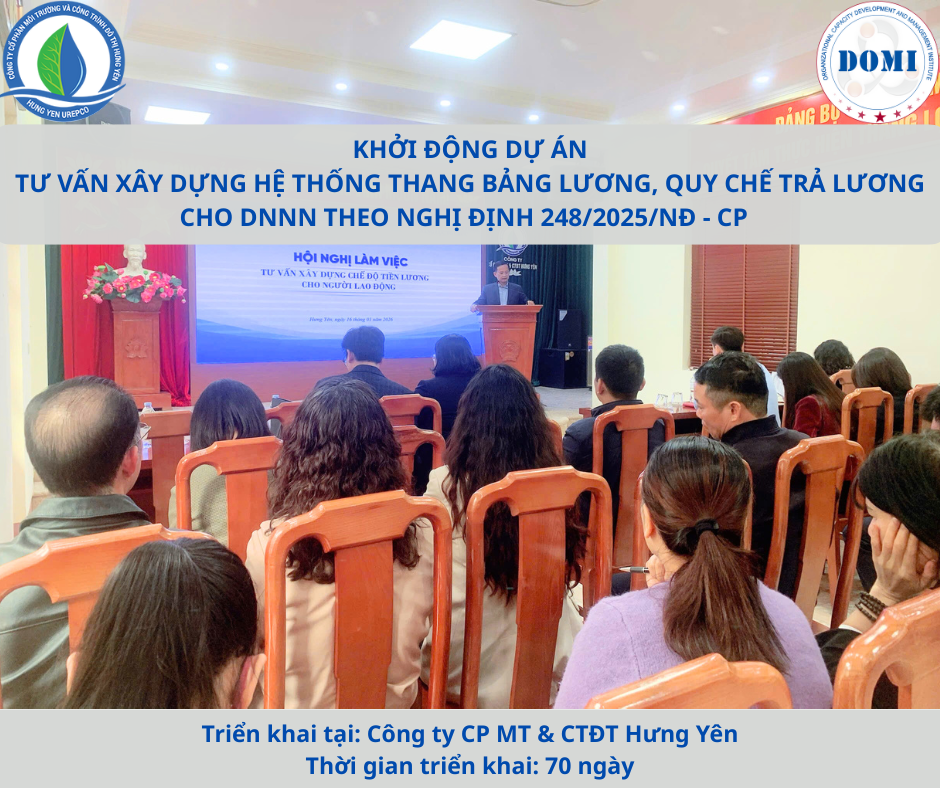 Vào ngày 16/01/2026 vừa qua, tại Công ty CP Môi trường và Công trình Đô thị Hưng Yên, Viện Quản lý và Phát triển Năng lực Tổ chức (DOMI) đã phối hợp cùng Ban lãnh đạo tổ chức Lễ khởi động và triển khai Dự án tư vấn xây dựng thang bảng lương, phụ cấp lương và quy chế trả lương, nguyên tắc chuyển xếp lương cho người lao động, ban điều hành, thành viên hội đồng và kiểm soát viên của Công ty CP Môi trường và Công trình Đô thị Hưng Yên.