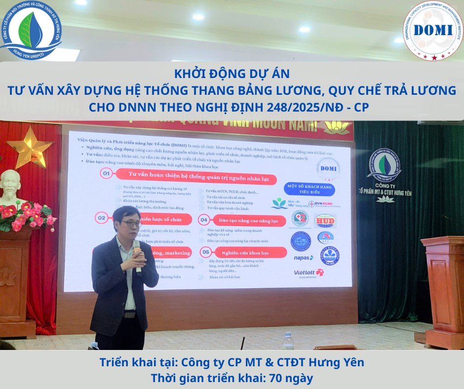 Vào ngày 16/01/2026 vừa qua, tại Công ty CP Môi trường và Công trình Đô thị Hưng Yên, Viện Quản lý và Phát triển Năng lực Tổ chức (DOMI) đã phối hợp cùng Ban lãnh đạo tổ chức Lễ khởi động và triển khai Dự án tư vấn xây dựng thang bảng lương, phụ cấp lương và quy chế trả lương, nguyên tắc chuyển xếp lương cho người lao động, ban điều hành, thành viên hội đồng và kiểm soát viên của Công ty CP Môi trường và Công trình Đô thị Hưng Yên.